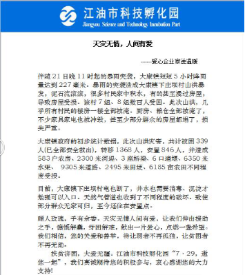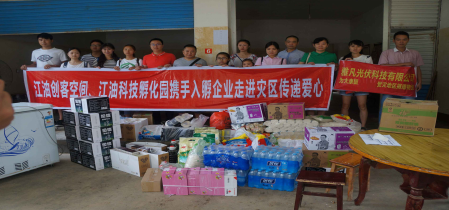 “7.21”的暴雨突襲,江油市大康鎮部分鄉村受洪澇之災。部分村民的樓房被淹,不少家具家電被沖毀,甚至少部分群眾的房屋都塌了,損失嚴重。一方有難,八方支援,江油市科技孵化園在第一時間發起倡議書組織入孵企業“走進災區,傳遞愛心”。